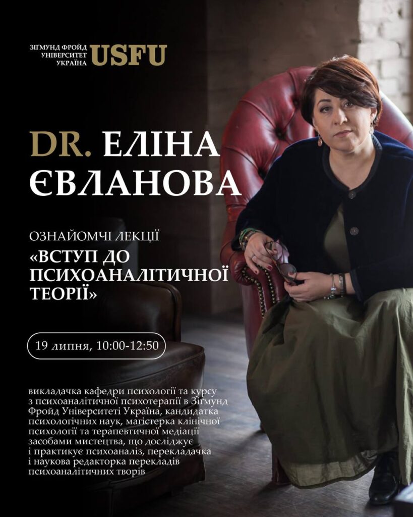 Лекції проводитиме Dr. Еліна Євланова – викладачка кафедри психології та курсу з психоаналітичної психотерапії в Зіґмунд Фройд Університеті Україна, кандидатка психологічних наук, магістерка клінічної психології та терапевтичної медіації засобами мистецтва, що досліджує і практикує психоаналіз, перекладачка і наукова редакторка перекладів психоаналітичних творів.